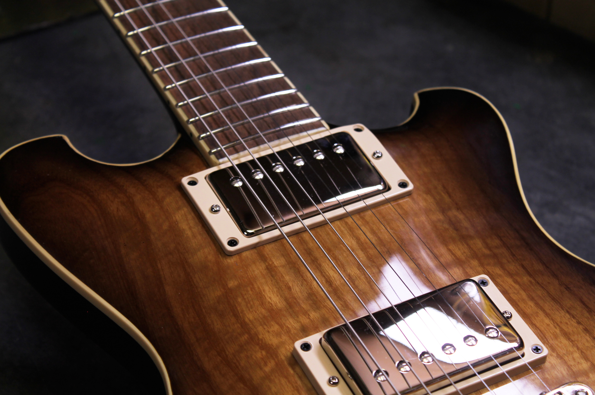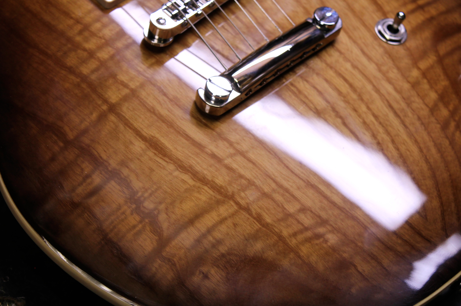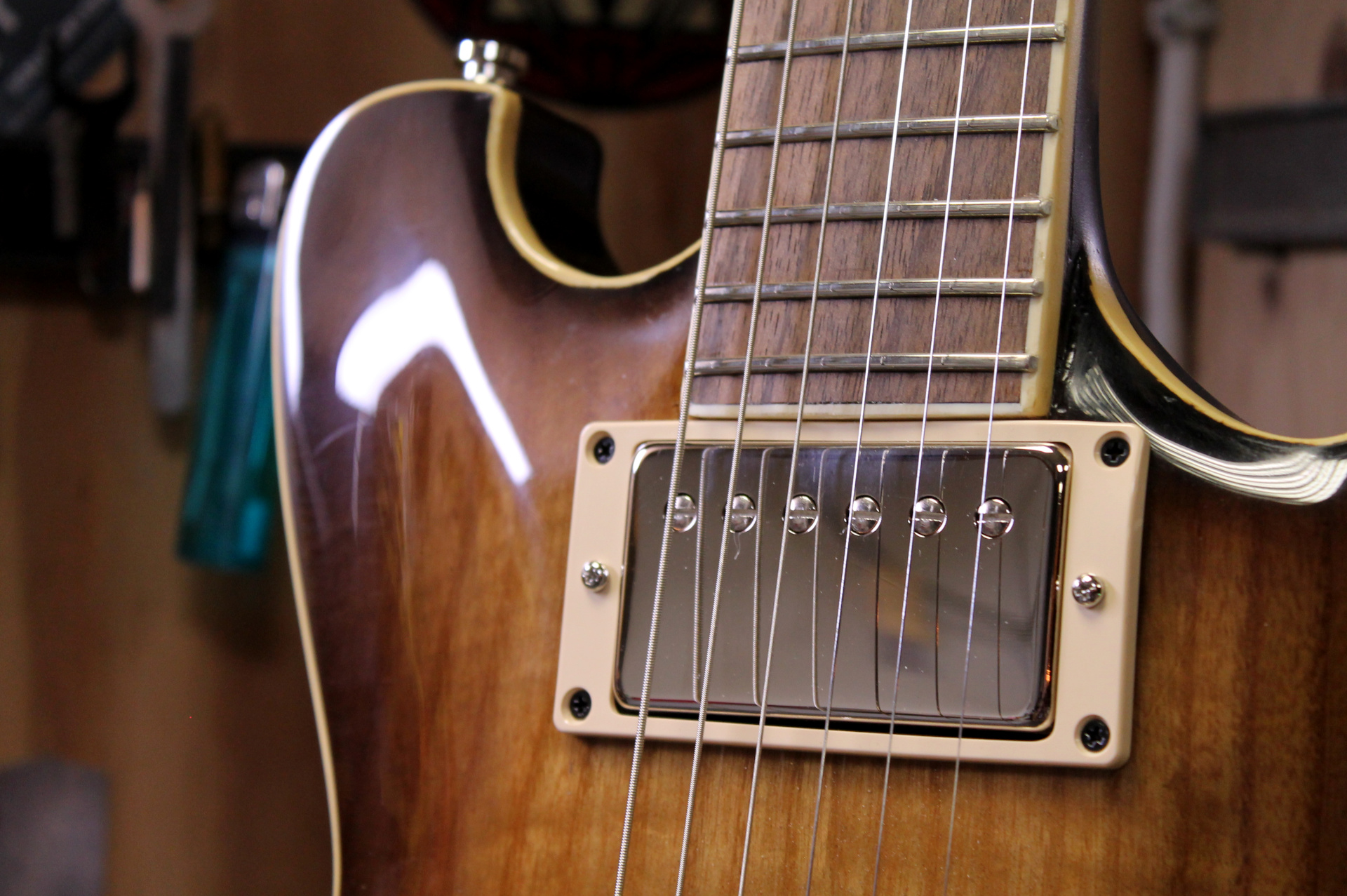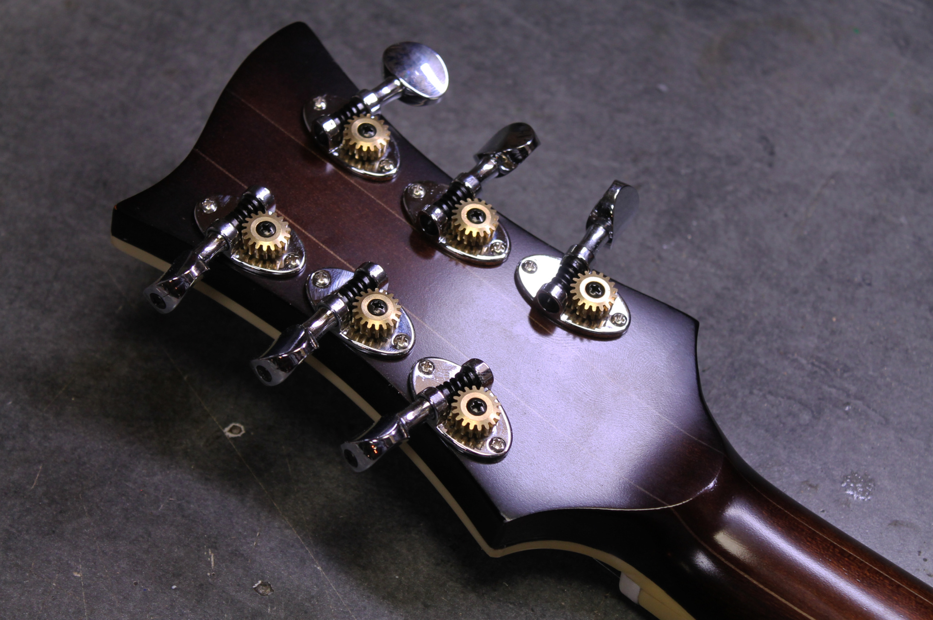 Cette Airea Symbiose semble classique de face, mais révèle à l’arrière un manche traversant qui accentue le jeu dans les aigus. Un choix de conception pensé dès l’origine pour offrir une jouabilité optimisée. Avec sa table en frêne ondé et son filet de finition présent jusque autour de la tête, cette guitare propose un équilibre subtil entre lutherie soignée et simplicité élégante.