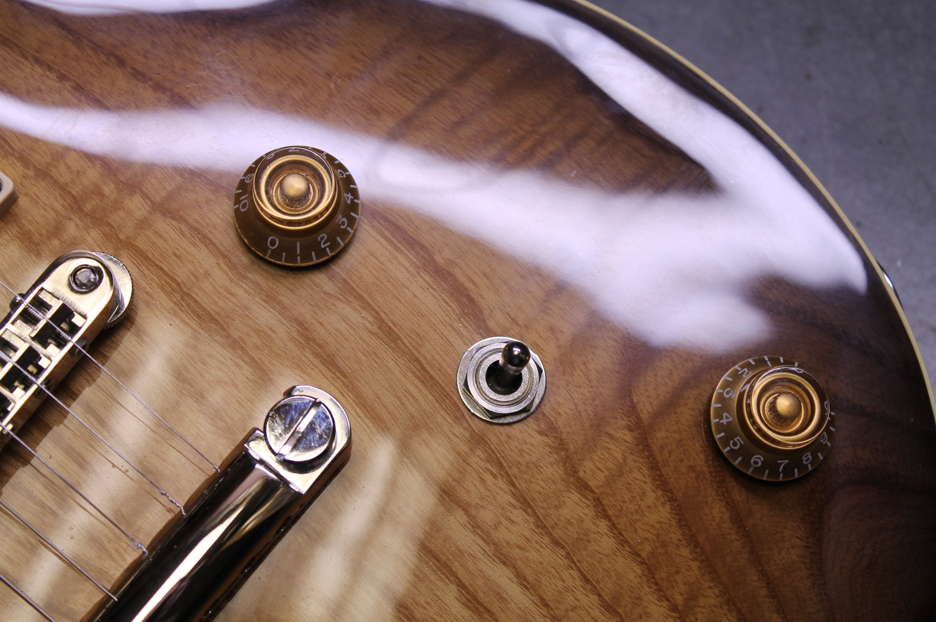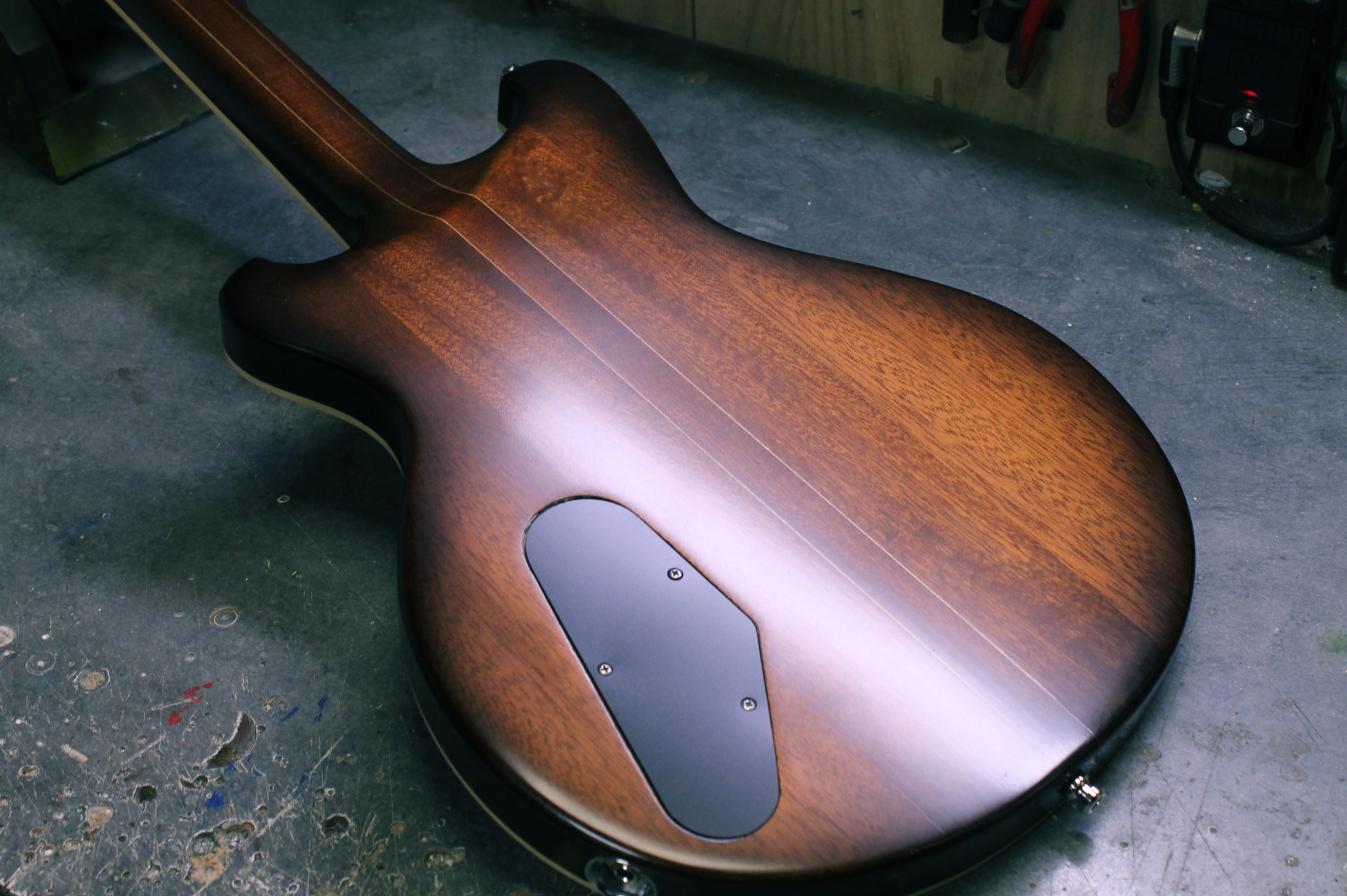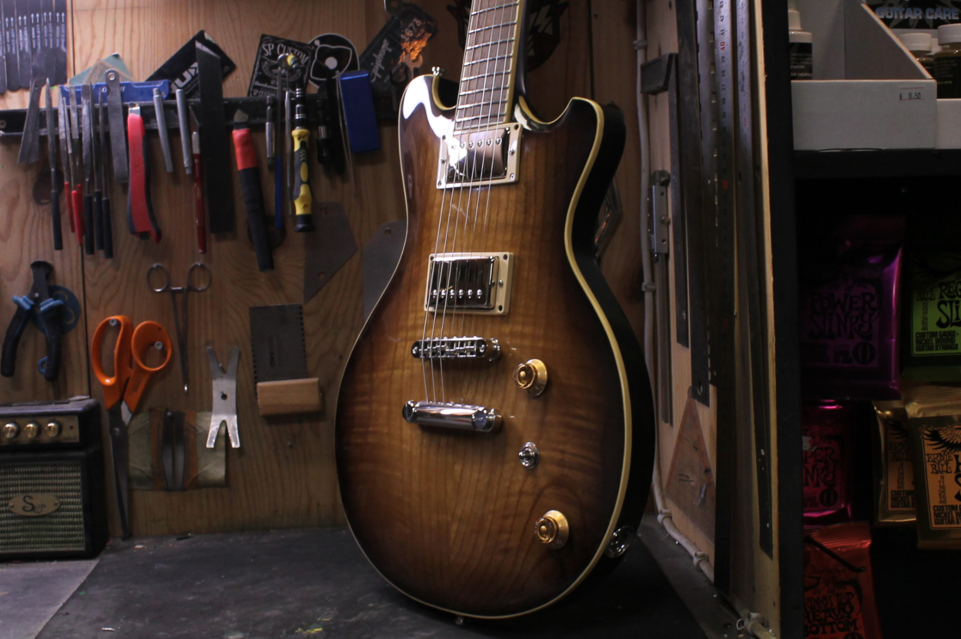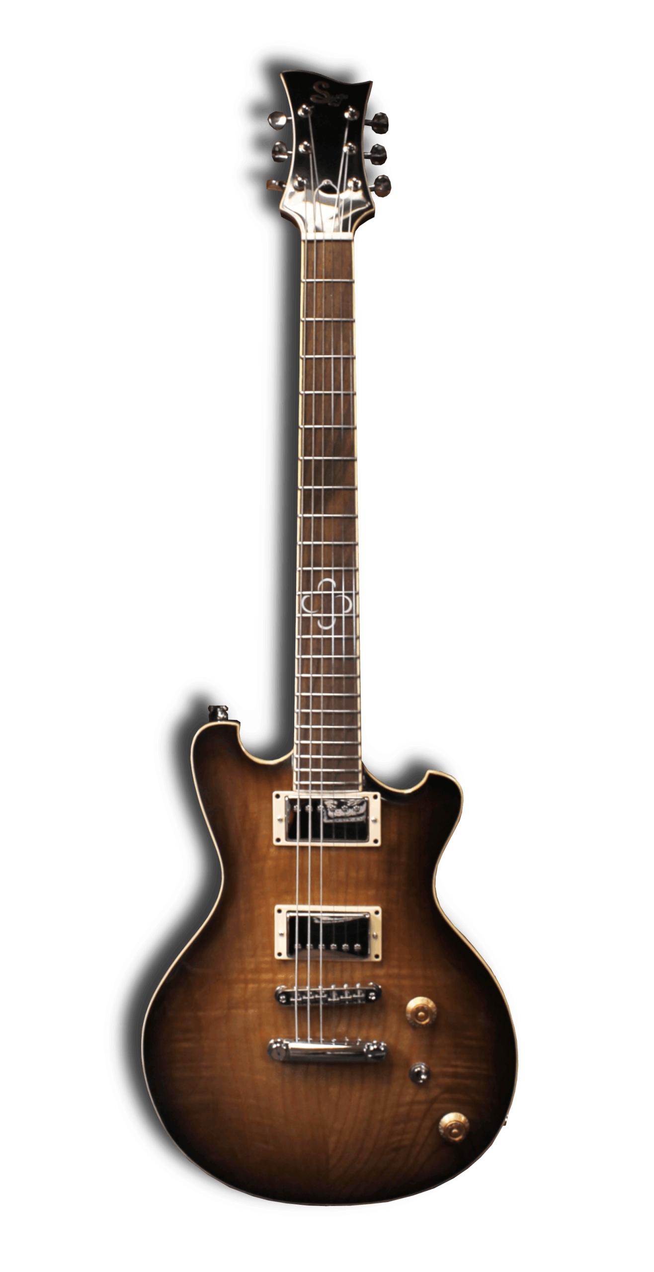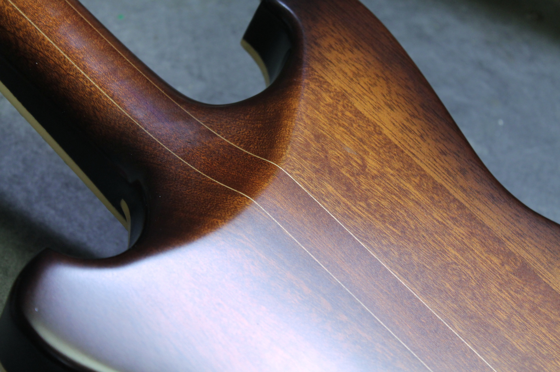 Cette Airea Symbiose semble classique de face, mais révèle à l’arrière un manche traversant qui accentue le jeu dans les aigus. Un choix de conception pensé dès l’origine pour offrir une jouabilité optimisée. Avec sa table en frêne ondé et son filet de finition présent jusque autour de la tête, cette guitare propose un équilibre subtil entre lutherie soignée et simplicité élégante.