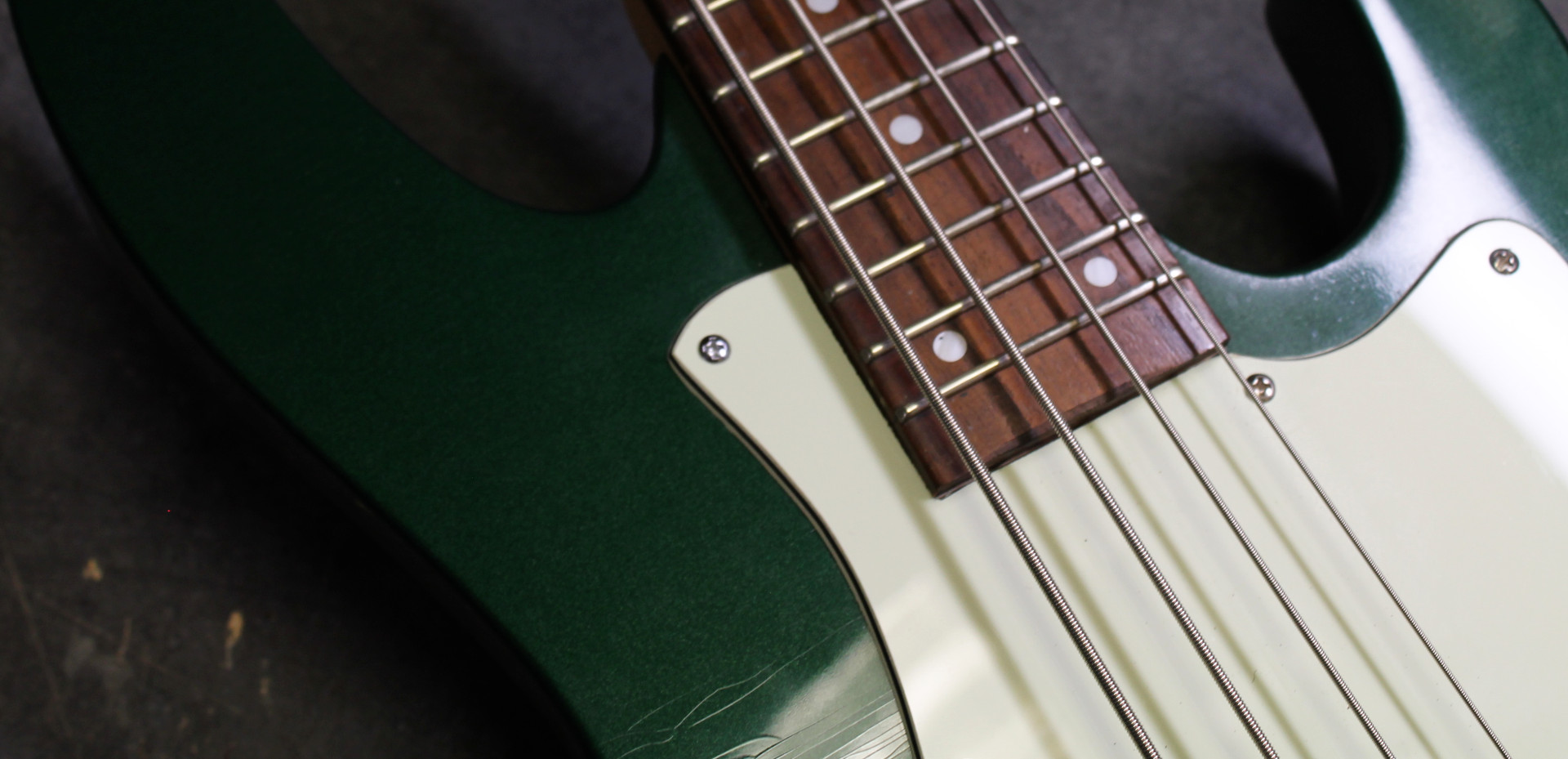 Ne vous fiez pas à son micro unique, c'est un Trinity Basse de chez SP custom. Grâce à ça on peut avoir une fois le micro splitté un véritable son de micro simple. On en a profité pour lui refaire une couleur un peu plus "funky" avec une finition faïencé pour plus de texture.