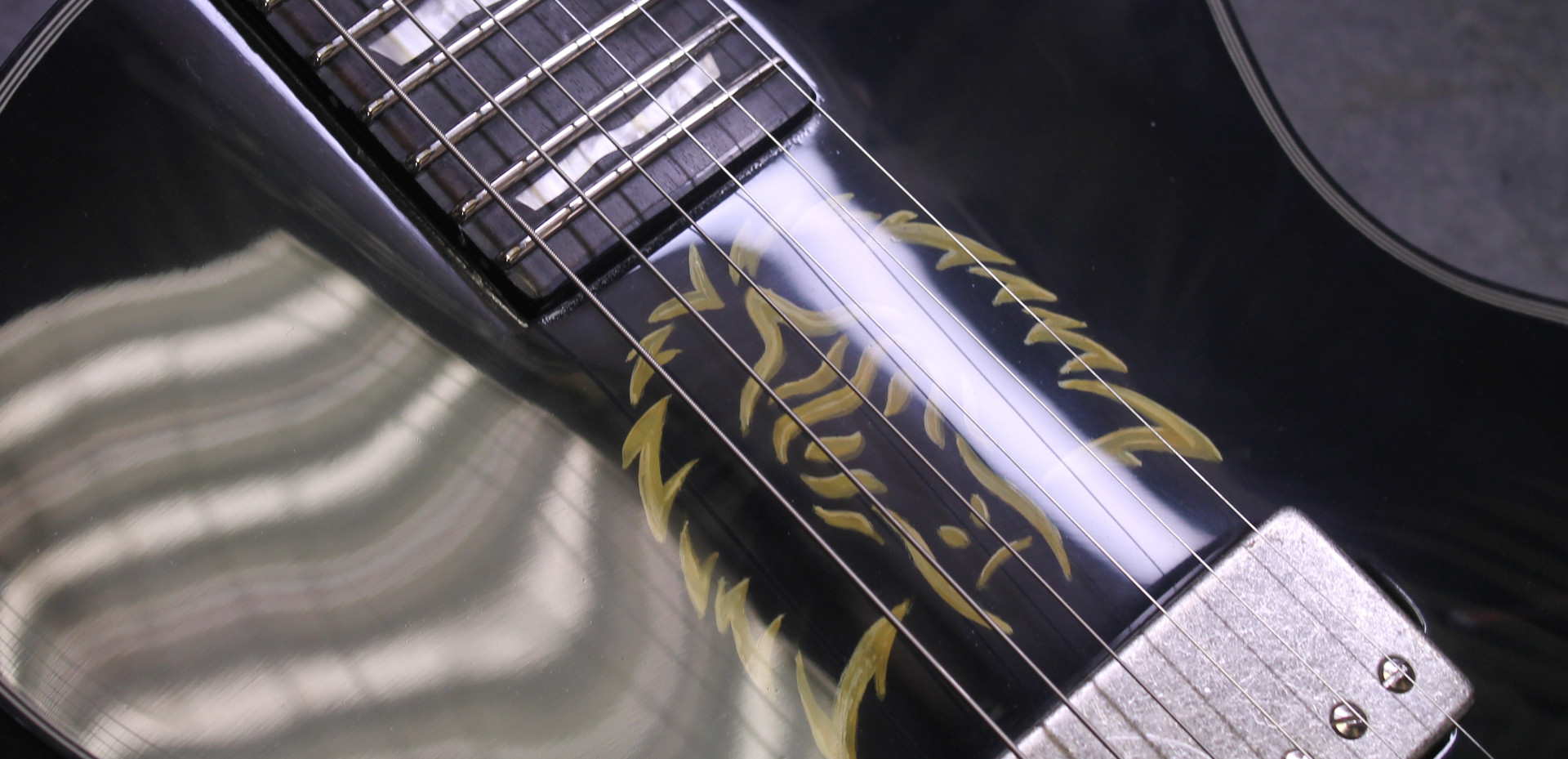 La guitare a été entièrement customisée : la table a été peinte à l’aérographe pour représenter un feuillage organique, tandis que le lettrage et le logo ont été minutieusement réalisés à la main au pinceau.